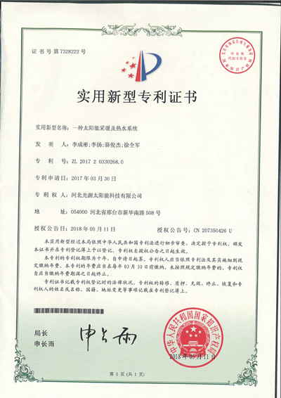 實(shí)用新型專利證書(shū)--一種太陽(yáng)能采暖及熱水系統(tǒng)(2)