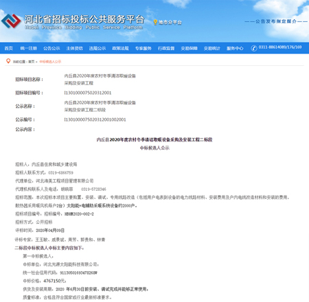 在抗疫的關(guān)鍵時(shí)期,復(fù)工復(fù)產(chǎn)正在如火如荼的進(jìn)行,沒有什么能比一份中標(biāo)通知書更能振奮人心了。在營(yíng)銷工作舉步艱難的特殊時(shí)期,河北光源太陽能科技有限公司,中標(biāo)內(nèi)丘縣2020年度農(nóng)村冬季清潔取暖設(shè)備采購及安裝工程,為我公司2020年度輝煌的經(jīng)營(yíng)業(yè)績(jī)?cè)偬頋饽夭实囊还P。