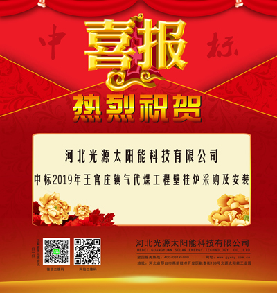 喜報(bào)頻傳,河北光源太陽(yáng)能科技有限公司,在2019年09月16日,2019年王官莊鎮(zhèn)氣代煤工程壁掛爐采購(gòu)及安裝項(xiàng)目的競(jìng)標(biāo)中,憑借過(guò)硬的產(chǎn)品質(zhì)量,扎實(shí)高效的工作作風(fēng),卓越的運(yùn)作團(tuán)隊(duì)和良好的企業(yè)信譽(yù),以絕對(duì)的優(yōu)勢(shì)順利中標(biāo)。